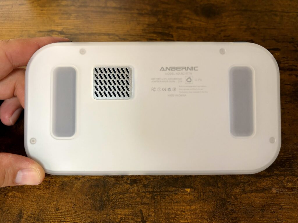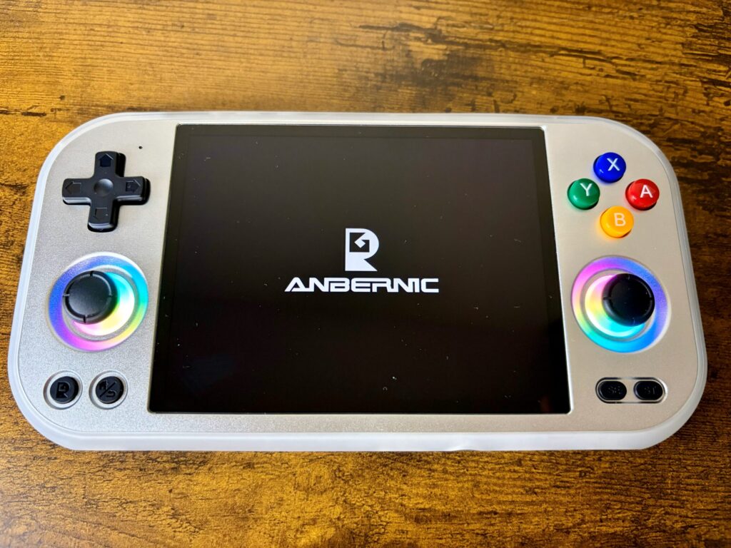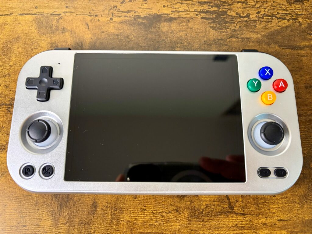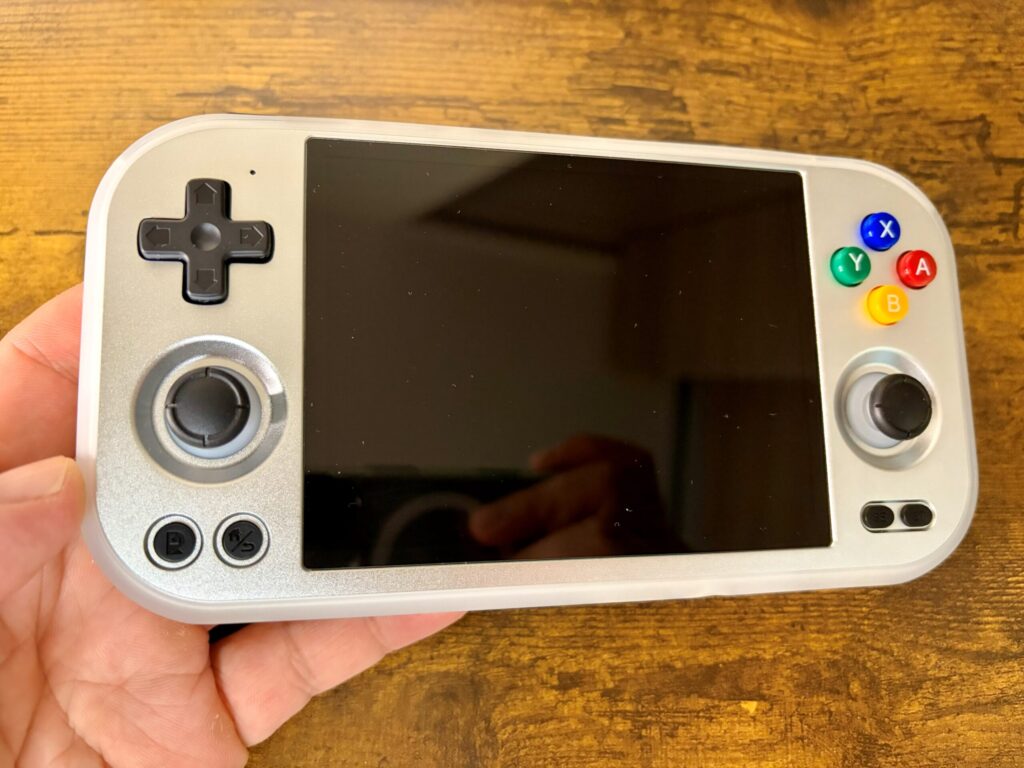 ▼本体正面:筐体はANBERNICおなじみのアルミ合金製。このひんやりとした金属の質感、やっぱり所有欲を満たしてくれますね〜!!画面も4.7インチ(4:3比率)ということで、少し大きめの画面で遊びたい人にはちょうど良いサイズ感です。