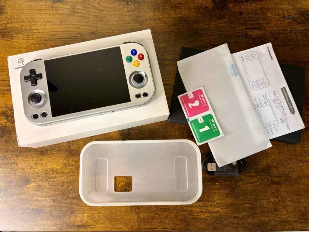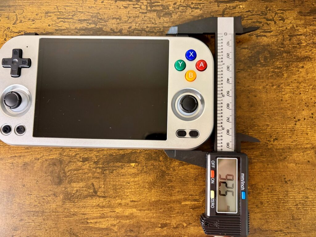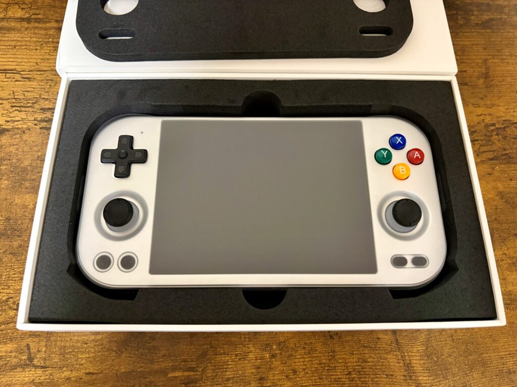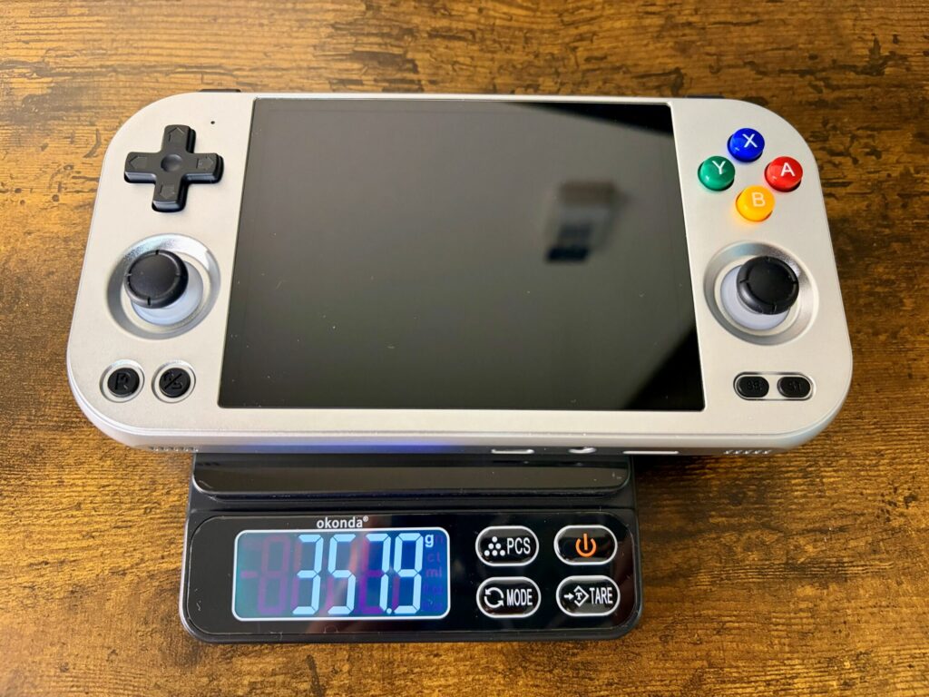 ▼本体正面:筐体はANBERNICおなじみのアルミ合金製。このひんやりとした金属の質感、やっぱり所有欲を満たしてくれますね〜!!画面も4.7インチ(4:3比率)ということで、少し大きめの画面で遊びたい人にはちょうど良いサイズ感です。