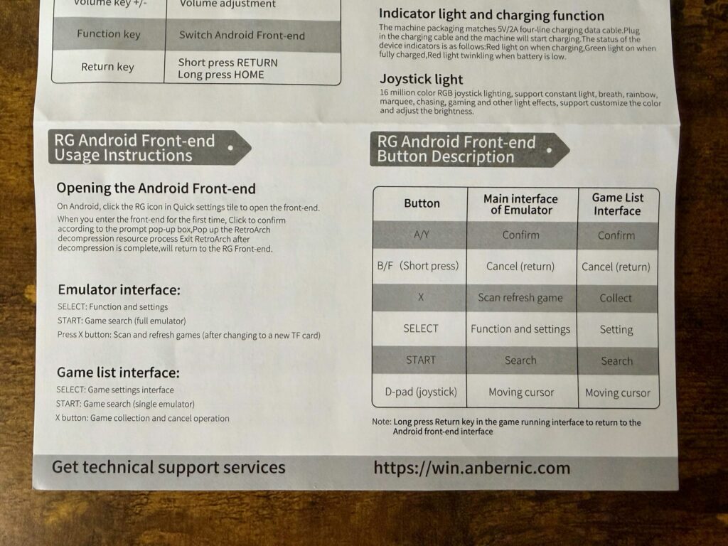 ▼RGフロントエンド(ANBERNICのオリジナルゲーム管理画面)の使い方などが記載されています。RGアイコンからフロントエンド起動できるよ、セレクトボタンでセッティング、Xボタンでゲームリストのスキャンなどができるよなんて書かれています。